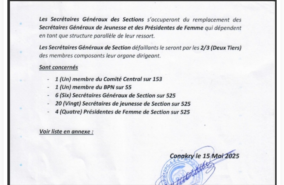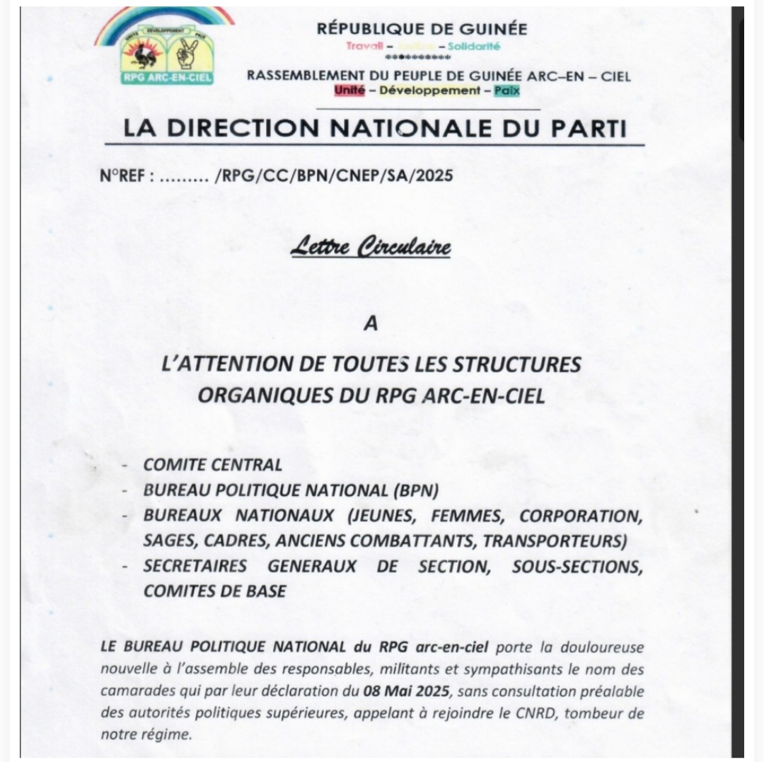 RPG : Alpha Condé a puni les soutients au CNRD 27 mai 2025 Non Par LA RÉDACTION Alpha Condé tente de reprendre la main suite à l’OPA du CNRD sur le RPG. Le parti vient de publier une liste des personnes qui ont été présentées comme étant soutien du CNRD mais aussi accusés de déstabiliser le vieux parti. Post Views: 306 Publications similaires : Alpha Condé réagit après la suspension de sa formation politique Alpha Condé dénonce les »manoeuvres du CNRD » visant à affaiblir son parti Ouest du Niger: au moins une quarantaine de soldats tués à Eknewane dans une attaque jihadiste Sénégal : l’arrestation de Mansour Faye provoque la colère de son parti