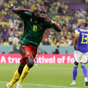 Aboubakar esulta per il gol in Camerun-Brasile –