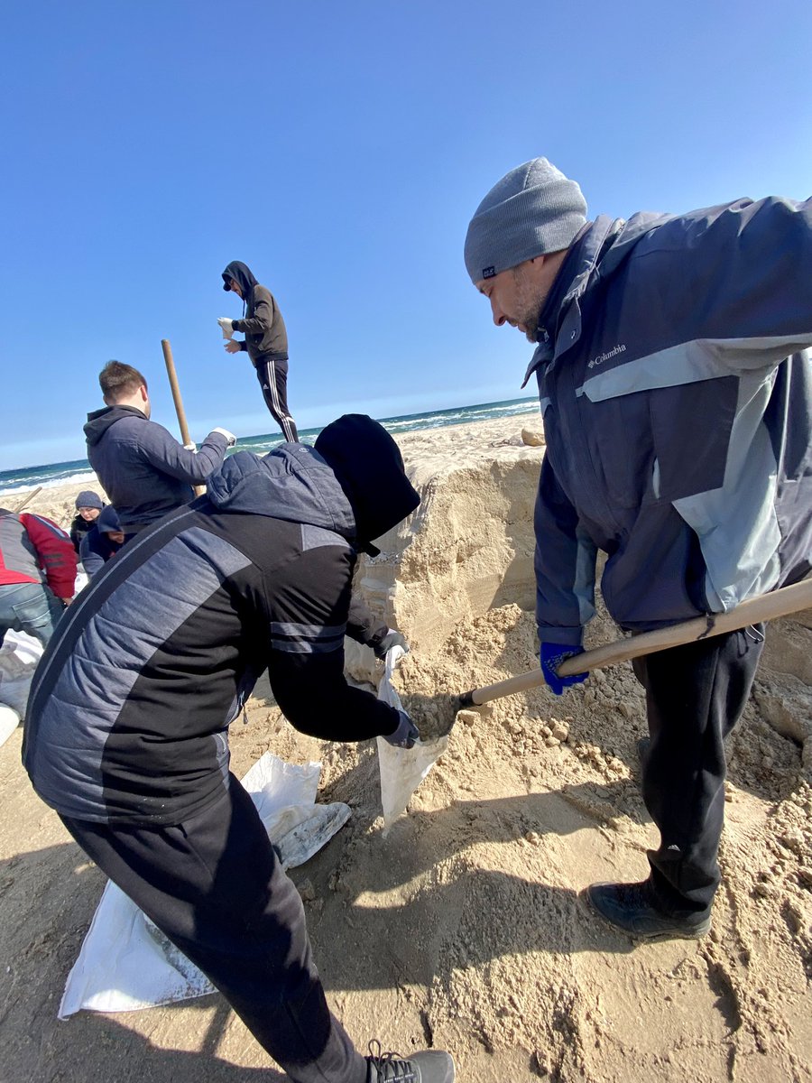 #UKRAINE À Odessa, la tension est montée d’un cran hier soir avec l’approche de navires militaires russes dans la baie : ce matin, sur la plage, les volontaires continuent de remplir des sacs de sable pour renforcer les barrages #Odessa #UkraineUnderAttack #UkraineRussianWar https://t.co/bPmrioEgun