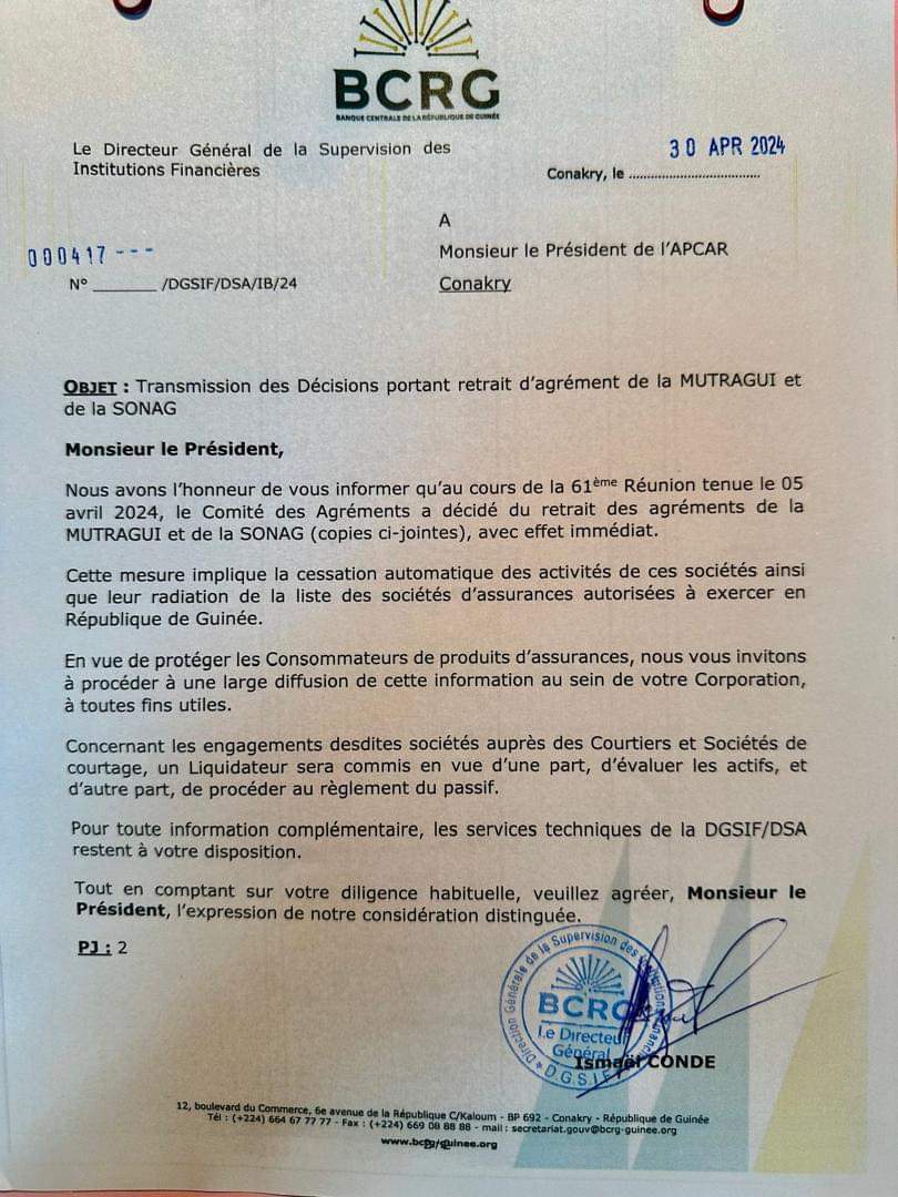 1 mai 2024La Banque Centrale de la République de Guinée (BCRG) a informé qu’au cours de la 61ème réunion tenue le 05 avril dernier, le comité des agréments a décidé du retrait des agréments de la MUTRAGUI et de la SONAG, avec effet immédiat.