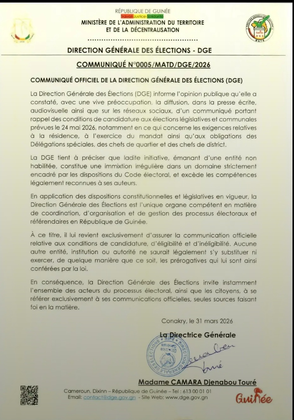 Conakry, 31 mars 2026 – La Direction Générale des Élections (DGE) a exprimé sa vive préoccupation face à la circulation d’un communiqué non officiel relatif aux conditions de candidature aux élections législatives et communales prévues le 24 mai 2026.
