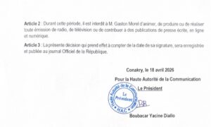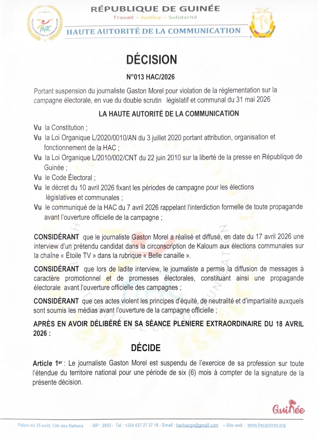 La Haute Autorité de la Communication (HAC) a annoncé, à travers la décision a  rendue publique le 18 avril 2026 à Conakry, la suspension du journaliste Gaston Morel pour une durée de six mois. Cette sanction intervient à la suite d’une violation présumée des encadrant la période préélectorale en Guinée, à quelques semaines du double scrutin législatif et communal prévu le 31 mai 2026.