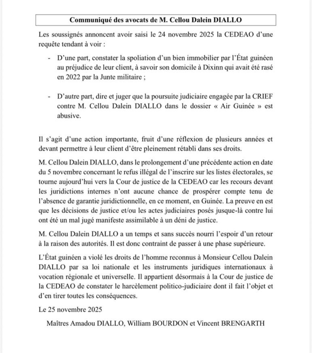 Conakry, 25 nov 2025 – Les avocats de l’opposant guinéen Cellou Dalein Diallo ont annoncé avoir saisi, le 24 novembre, la Cour de justice de la CEDEAO afin de dénoncer la « spoliation » d’un bien immobilier et une « poursuite judiciaire abusive » engagée contre leur client.