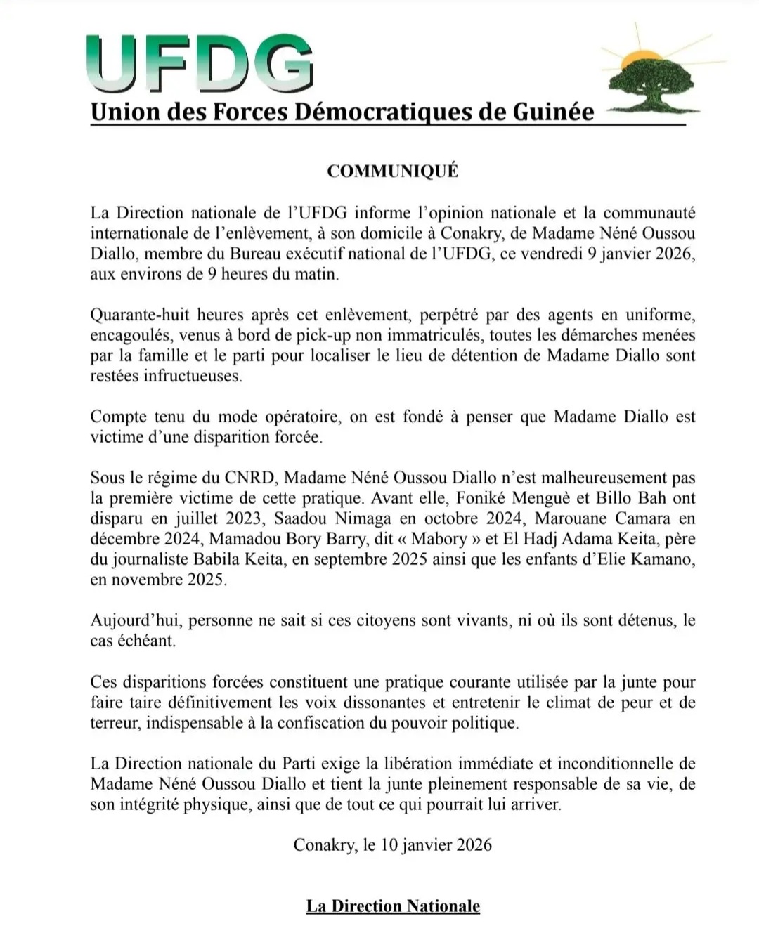 10 janvier 2026Conakry, 10 janvier 2026 – L’Union des Forces Démocratiques de Guinée (UFDG) a dénoncé, ce samedi, l’enlèvement de Madame Néné Oussou Diallo, membre de son Bureau exécutif national, survenu à son domicile à Conakry le vendredi 9 janvier 2026, aux environs de 9 heures du matin.