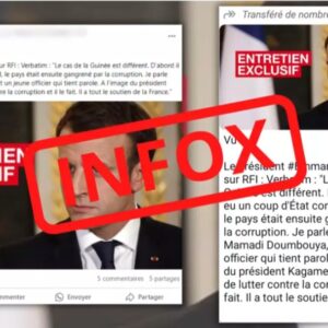 Cette publication WhatsApp se présente sous la forme d’un verbatim accompagné d’une photo. Le texte affirme, à tort, qu’Emmanuel Macron aurait récemment déclaré, dans une interview à Radio France Internationale : « Le cas de la Guinée est différent. D’abord il y a eu un coup d’État constitutionnel, le pays était ensuite gangrené par la corruption. Je parle souvent à Mamadi Doumbouya, c’est un jeune officier qui tient parole. À l’image du président Kagame, il est en train de lutter contre la corruption et il le fait. Il a tout le soutien de la France ».