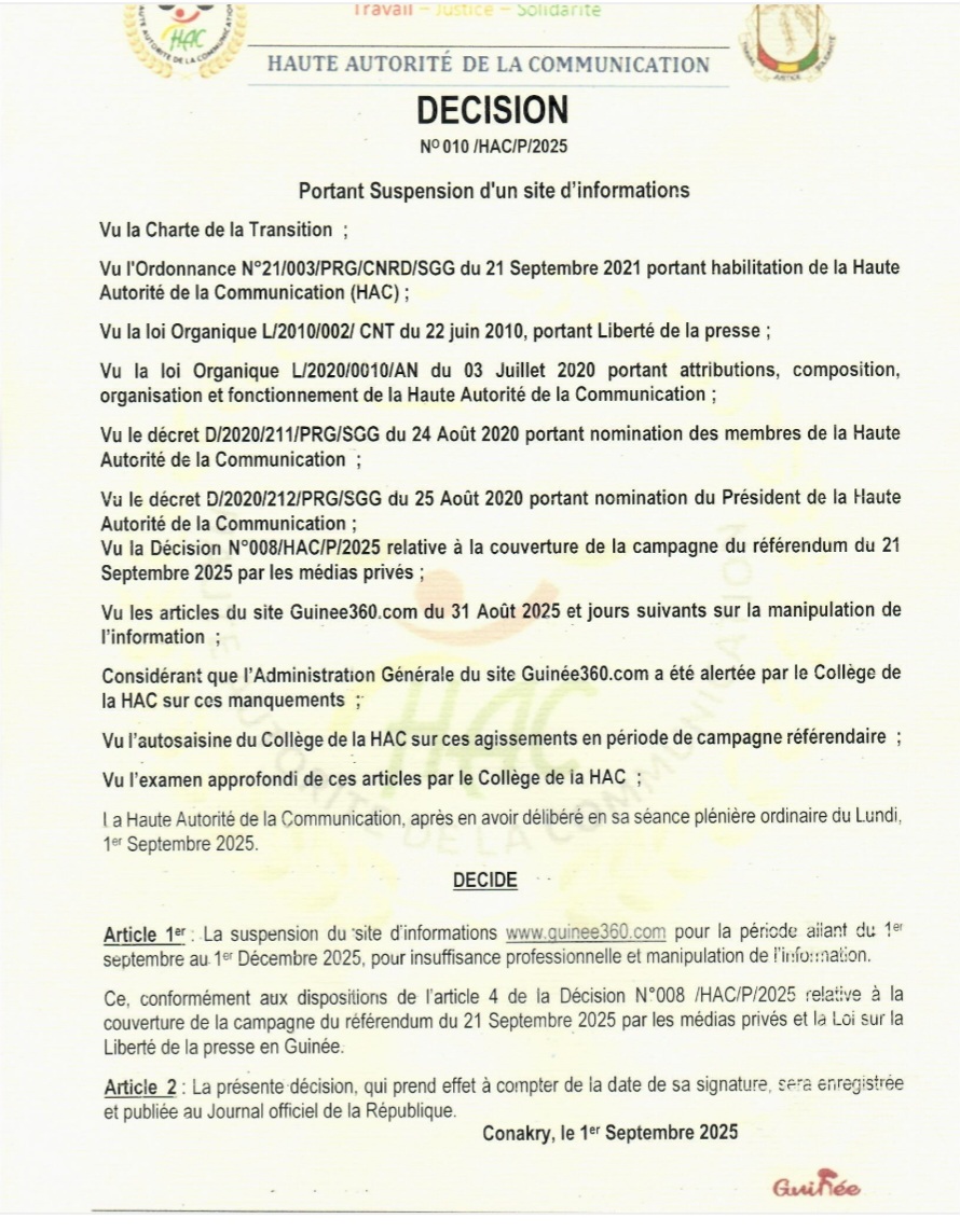 1 septembre 2025Conakry, le 1er septembre 2025 — La Haute Autorité de la Communication (HAC) a pris une décision forte à l’encontre du site d’informations Guinee360.com. Dans sa décision N°010/HAC/P/2025, l’institution de régulation des médias annonce la suspension du site pour une durée de trois mois, soit du 1er septembre au 1er décembre 2025.