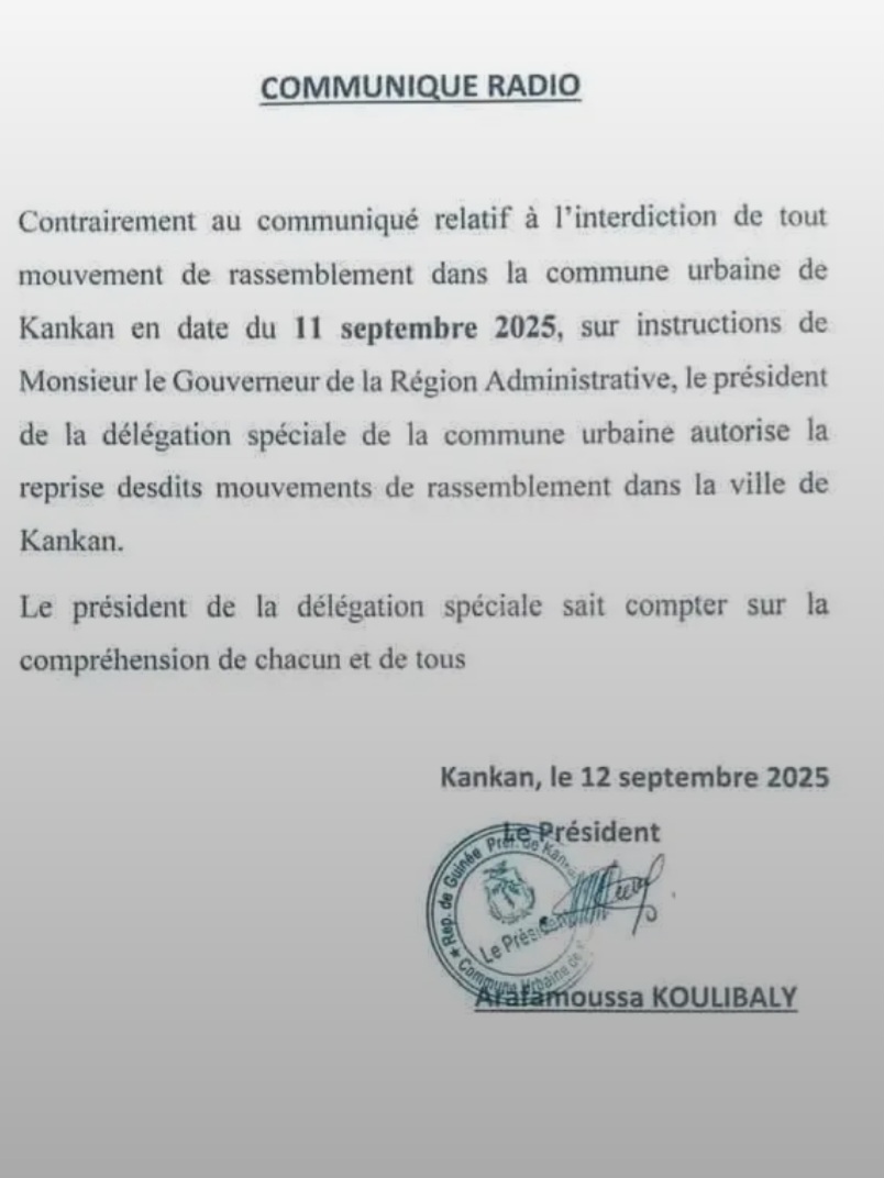 « Contrairement au communiqué relatif à l’interdiction de tout mouvement de rassemblement en date du 11 septembre 2025, le président de la délégation spéciale de la commune urbaine autorise la reprise desdits mouvements dans la ville de Kankan », précise le texte.