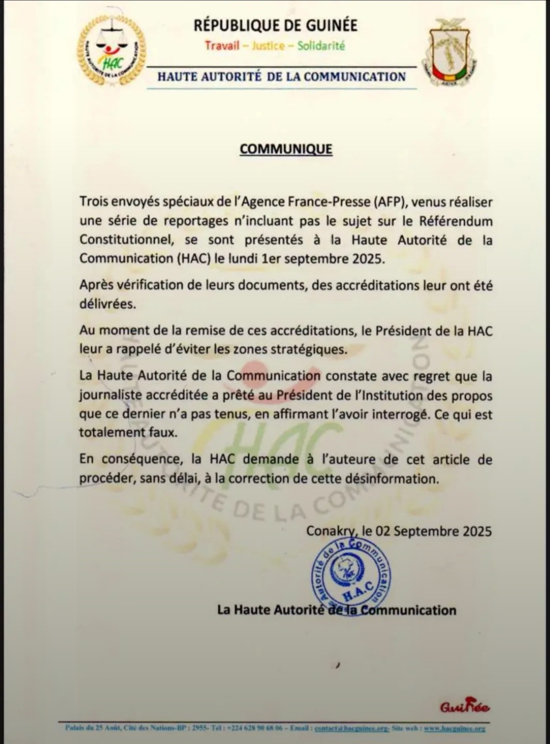 《 La Haute Autorité de la Communication (HAC) informe l’opinion publique qu’elle a reçu, le lundi 1er septembre 2025, trois envoyés spéciaux de l’Agence France-Presse (AFP), venus réaliser une série de reportages ne portant pas sur le Référendum Constitutionnel.