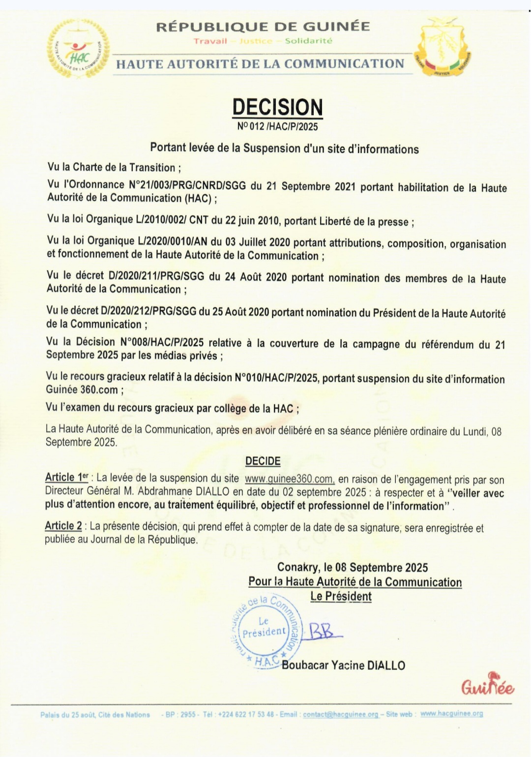 Conakry, 08 septembre 2025 – La Haute Autorité de la Communication (HAC) a annoncé ce lundi la levée de la suspension du site d’information Guinee360.com. Cette décision intervient après l’examen d’un recours gracieux déposé par le Directeur Général du site, M. Abdrahmane Diallo.