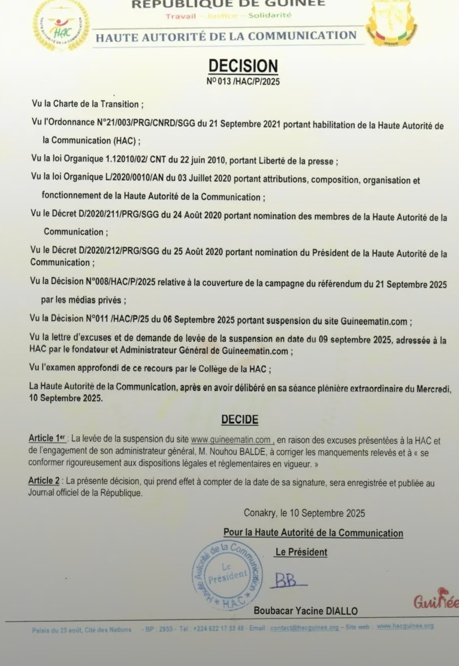 Conakry, 10 septembre 2025 – La Haute Autorité de la Communication (HAC) a annoncé, ce mercredi, la levée de la suspension du site d’information Guineematin.com, initialement sanctionné le 6 septembre 2025 pour des manquements aux règles encadrant la couverture de la campagne du référendum prévu le 21 septembre.