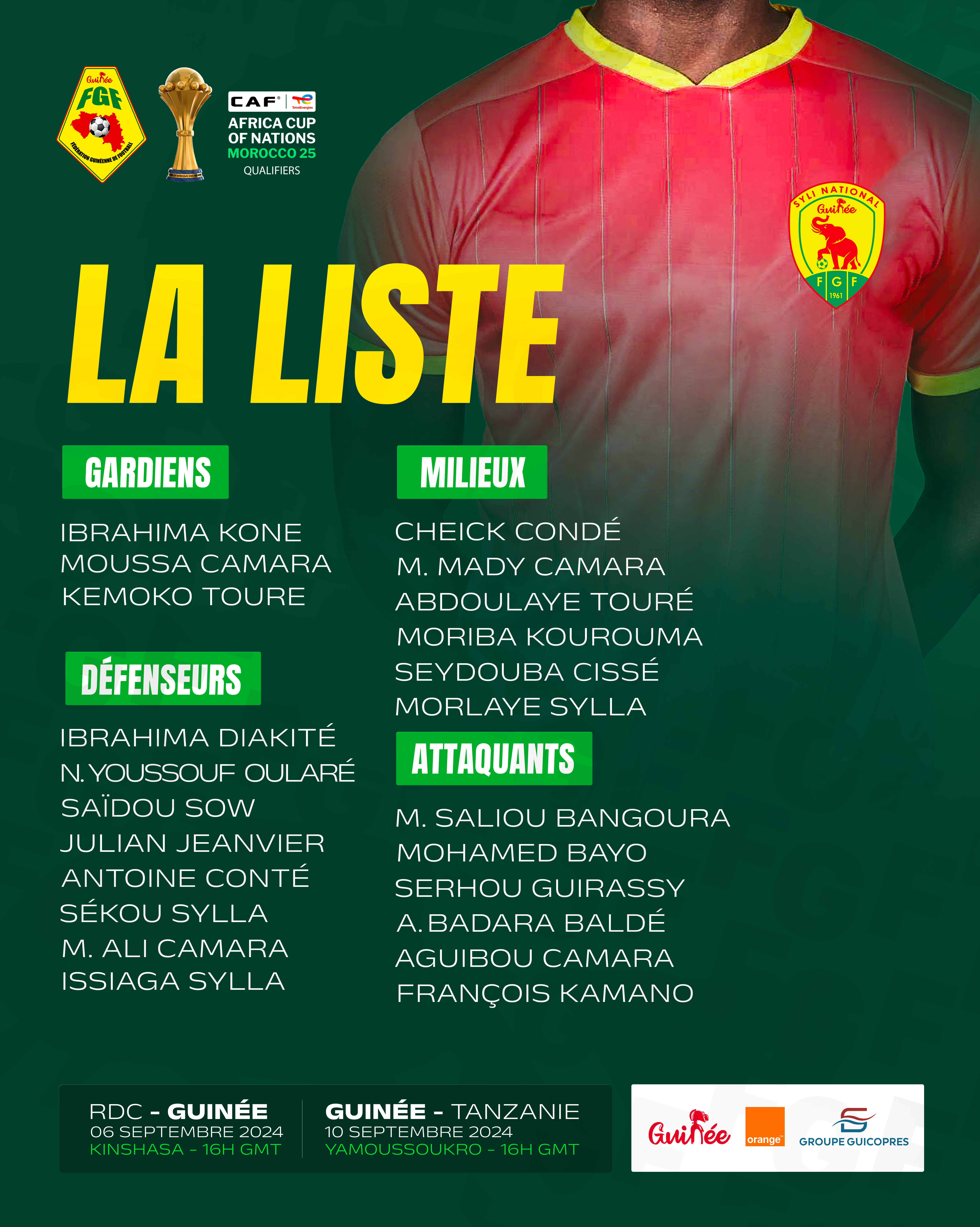 Les éliminatoires de la Coupe d’Afrique des Nations TotalEnergies Maroc 2025 débutent dans les prochains jours. Pour les deux premières journées de cette campagne de qualification, la Guinée affronte la RD Congo (6 septembre 2024 à Kinshassa) et la Tanzanie (10 septembre 2024 à Yamoussoukro). Pour ces rendez-vous, 23 ont été convoqués. Dans cette liste on compte 3 gardiens, 8 défenseurs, 6 milieux et 6 attaquants.