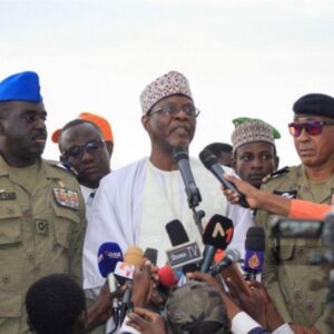 Le ministre des Affaires étrangères nigérien, Bakary Seydou Sangaré, lors d’un rassemblement pour exiger le départ de l’armée française près de la base militaire française à Niamey, au Niger. /Prix photo le 1er octobre 2023/REUTERS/Mahamadou Hamidou