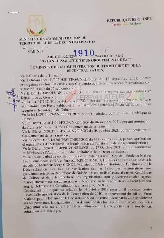 Les autorités militaires du pays ont toujours indiqué que le FNDC ( Front national pour la défense de la constitution ) n’existe pas. Et aujourd’hui contre toute attente, le ministre de l’administration du territoire indique avoir dissous le FNDC.