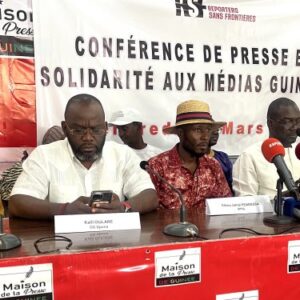 Lors de la conférence de presse organisée par RSF avec son partenaire local, l’Alliance des médias pour les droits humains (AMDH), les responsables des médias privés Djoma et FIM ont fait état de leurs préoccupations, rappelant la situation inédite que connaissent leurs médias depuis bientôt quatre mois. Le directeur général de Djoma Média – dont la radio et la chaîne de télévision sont actuellement bloqués –, Kalil Oularé, a déploré “la phase critique de l’histoire que traversent les médias en Guinée”, qui s’illustre par “la volonté de musellement des médias en les privant de leurs ressources”. RSF leur a témoigné sa solidarité et son soutien.