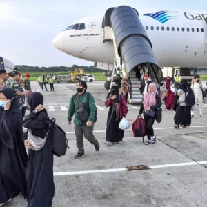 Des évacués du Soudan qui arrivent à Jakarta, en Indonésie, le 28 avril 2023. (HANDOUT / INDONESIAN FOREIGN MINISTRY / AFP)