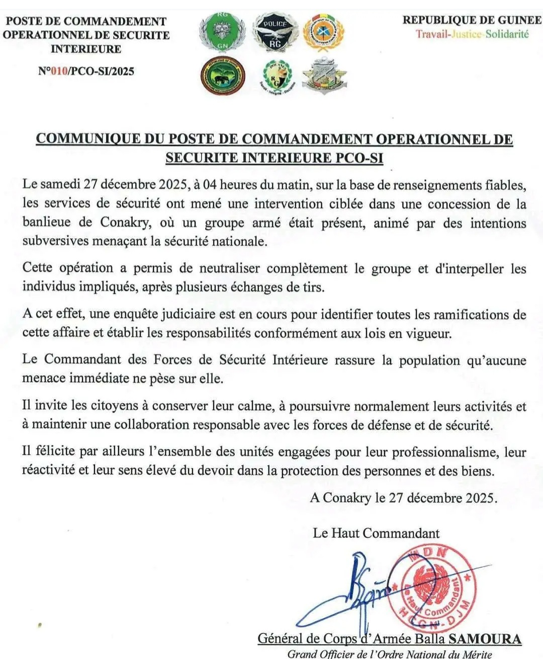 27 décembre 2025Conakry, 27 décembre 2025 — Au lendemain des échanges de tirs survenus dans la banlieue de Conakry, précisément à Sonfonia, les autorités militaires guinéennes sont sorties du silence. Dans un communiqué rendu public ce samedi, le Poste de Commandement Opérationnel de Sécurité Intérieure (PCO-SI) apporte des précisions sur les circonstances de l’intervention menée par les forces de sécurité.
